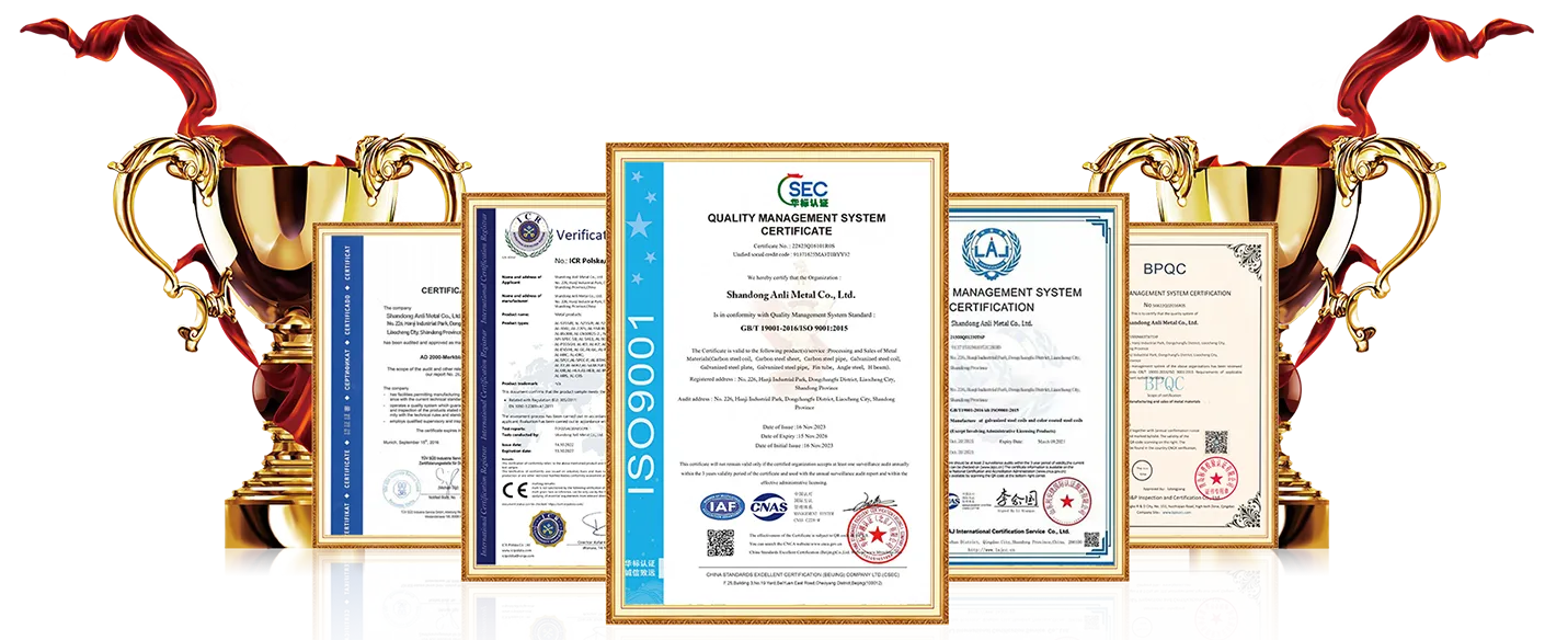 To meet the highest industry and export standards, Shandong Anli Metal Co., Ltd. has obtained a full set of certifications covering product quality, environmental compliance, and manufacturing reliability. All our steel products are subject to rigorous inspections and testing processes, ensuring consistency, performance, and safety.